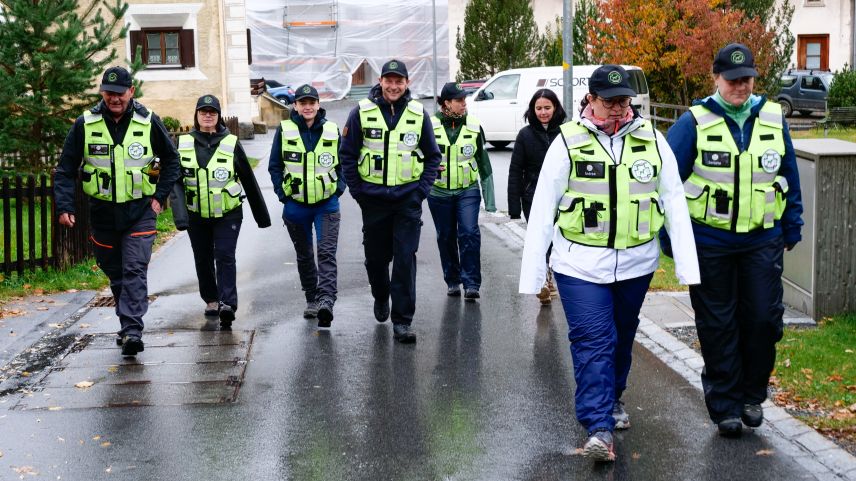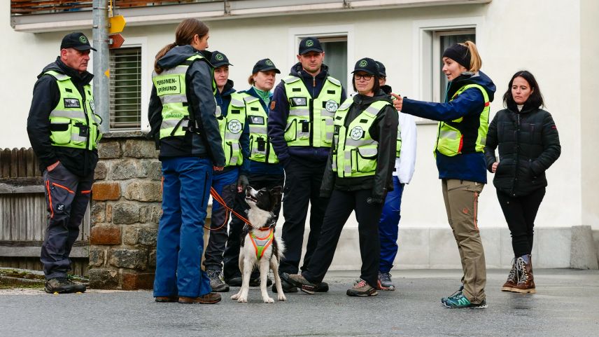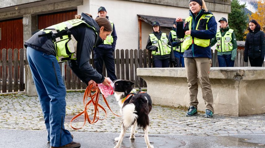 Szene aus einer Übung des Vereins der Personenspürhunde Engiadina und Protagonistin Maja Schmidli aus Samedan. Ihr fünfeinhalbjähriger Border Collie «Jazz» ist kurz davor, eine versteckte Person zu finden.