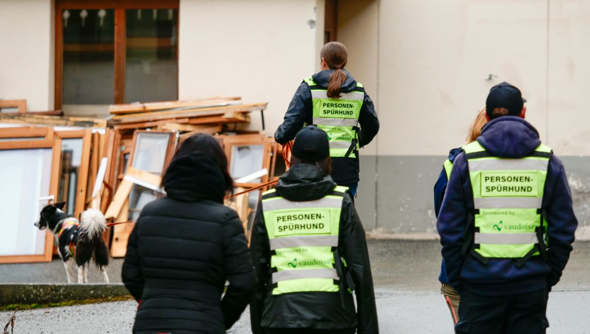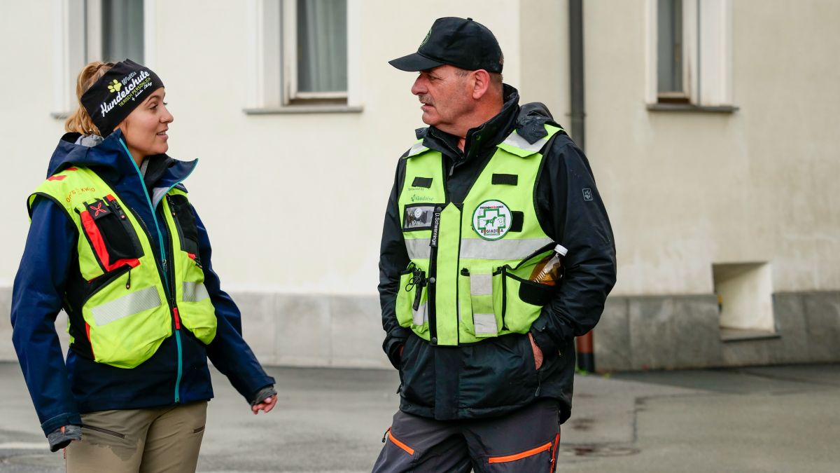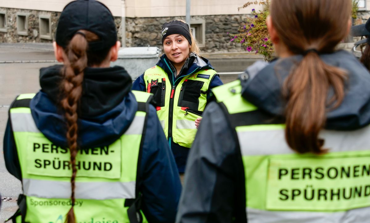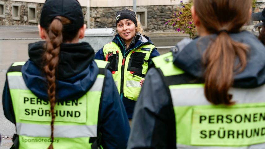 Maja Schmidli (links) gibt, beobachtet und angeleitet von der Hundeführerin Jessy Kalbermatter, ihrem «Jazz» eine zuvor präparierte Duftmarke der vermissten Person zu erschnuppern, bevor sie sich gemeinsam auf die Suche machen. Fotos: Jon Duschletta