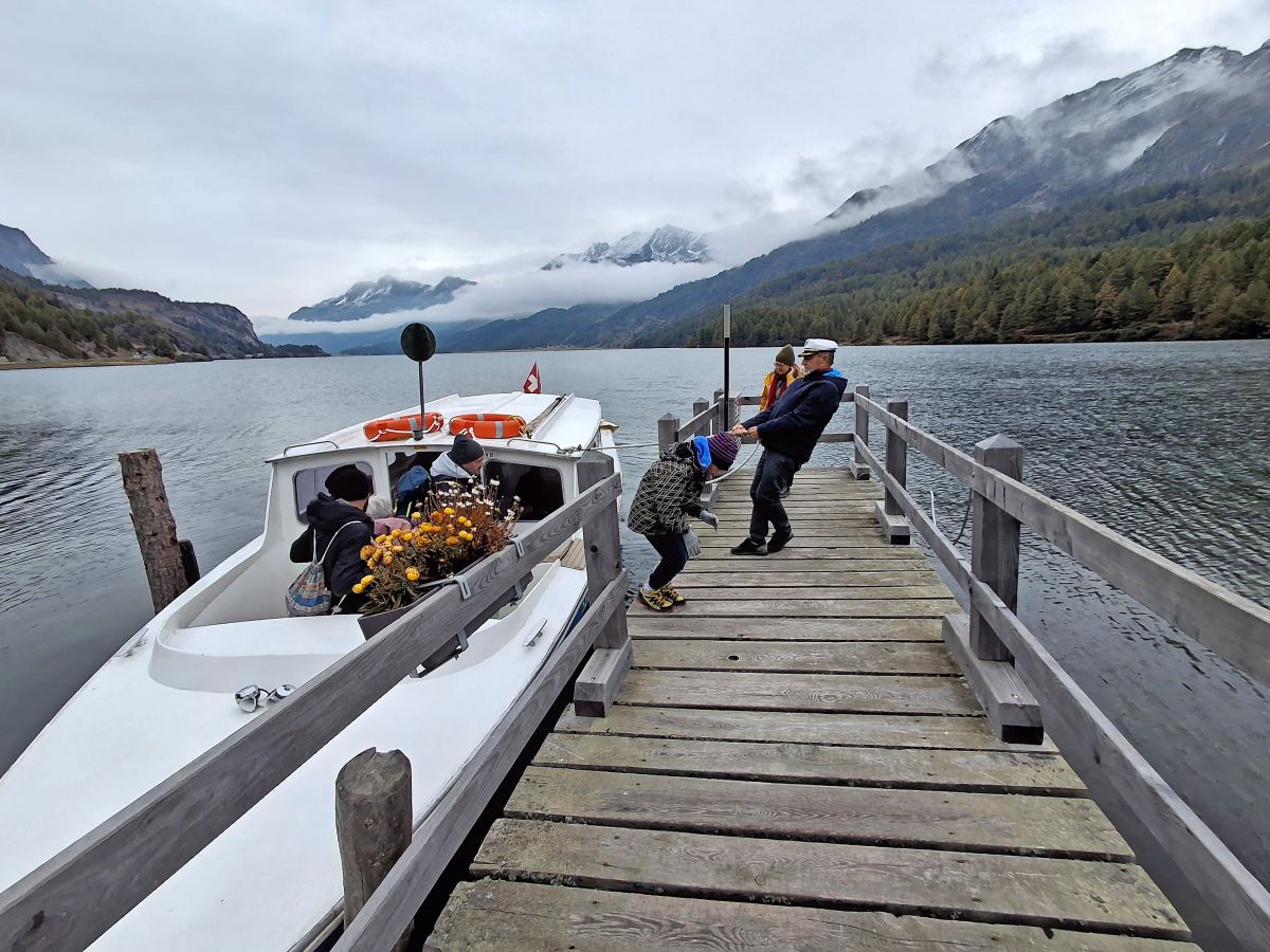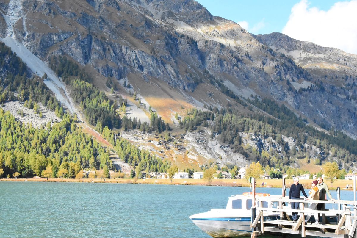 Gipfelpanorama, türkis schimmerndes Wasser, sich sanft im Wind wiegende Lärchenwälder am Ufer: Kapitän Franco Gianis Kursschiff im Oktober 2024 auf dem Silsersee.