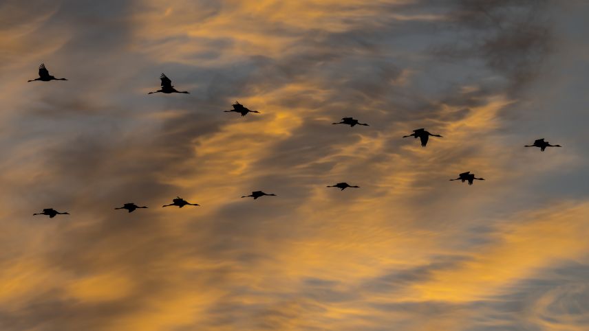 2011 aber geschah Aussergewöhnliches: In der Schweiz wurden während des Herbstzugs über zehn mal mehr Kraniche beobachtet als üblich. Seither blieb die Zahl beobachteter Kraniche mit Schwankungen hoch. Was ist passiert? Ein Teil der Kraniche, die normalerweise den ungarischen Hortobágy-Nationalpark passieren, um dann via Italien nach Nordafrika zu gelangen, änderte die Route. Statt über Italien nach Nordafrika flogen sie über die südfranzösische Camargue nach Spanien. 2011 wurde dieser Routenwechsel vermutlich durch starke Ostwinde unterstützt, aber auch in den Folgejahren wurde der neue Zugweg rege genutzt. Kraniche haben keine genetisch definierten Zugrouten, die erfahrenen Tiere geben ihr Wissen an die anderen weiter. Die neue Zugroute durch Mitteleuropa scheint den Kranichen zu behagen. «Da die Schweiz auf dem Weg zwischen Hortobágy und der Camargue liegt, dürfen auch wir uns vermehrt an den sehnsüchtig anmutenden Rufen durchziehender Kraniche erfreuen», schreibt die Vogelwarte.
