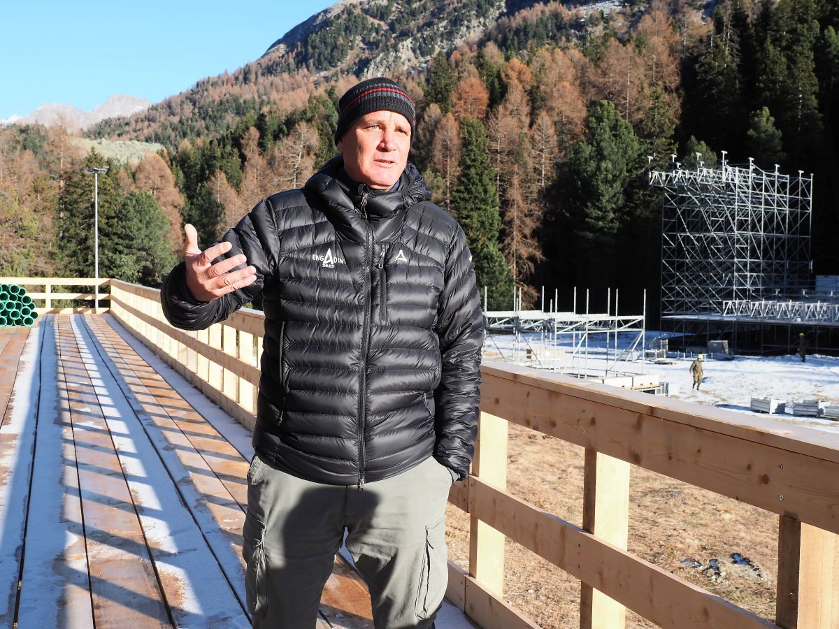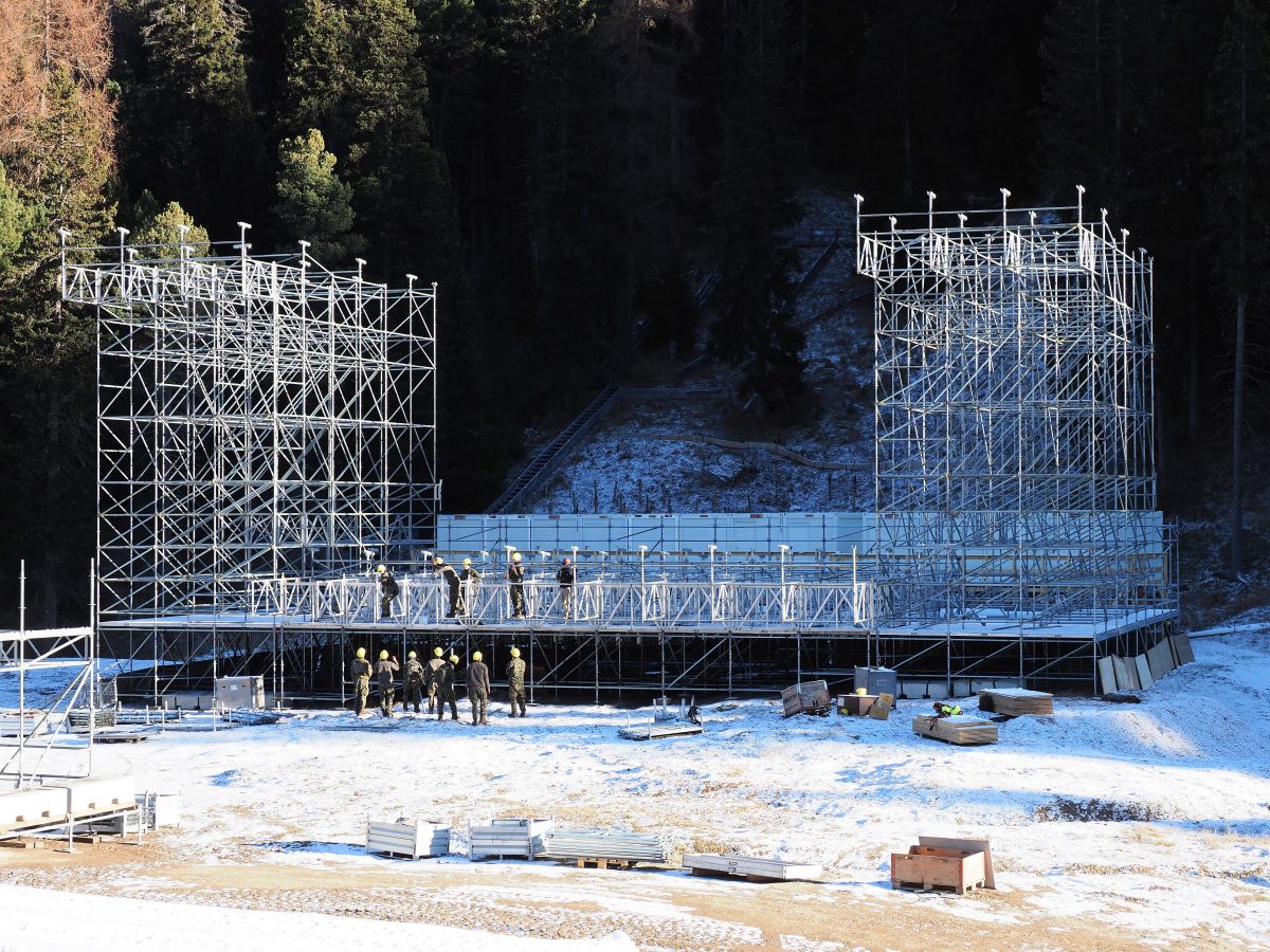 Wir sind hier noch bis Ende nächster Woche mit den Aufbauarbeiten beschäftigt. Dann gibt es bei den Hochbauten eine Pause bis Ende Januar. In der Zwischenzeit kümmern wir uns um die Schneearbeit. Ab Februar werden die verschiedenen Zelte, zum Beispiel für Sponsoren und Catering sowie Leinwände, weitere Plattformen und so weiter aufgestellt.