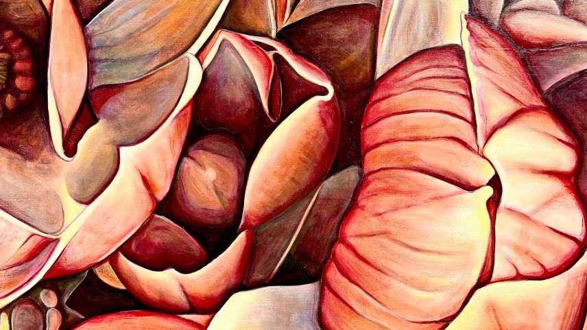 Die Künstlerin fokussiert kleine, zierliche Ausschnitte aus der Natur, von Blüten und Steinen oder auch von Lebewesen aus dem Meer. Sie zoomt diese in ihren Gemälden bis zur Abstraktion zu sanften, manchmal auch lauten und kräftigen Statements. Die meist intensiven Farben, die andeutungsvollen erotischen Formen und das Spiel von Licht und Schatten wirken verführerisch.
