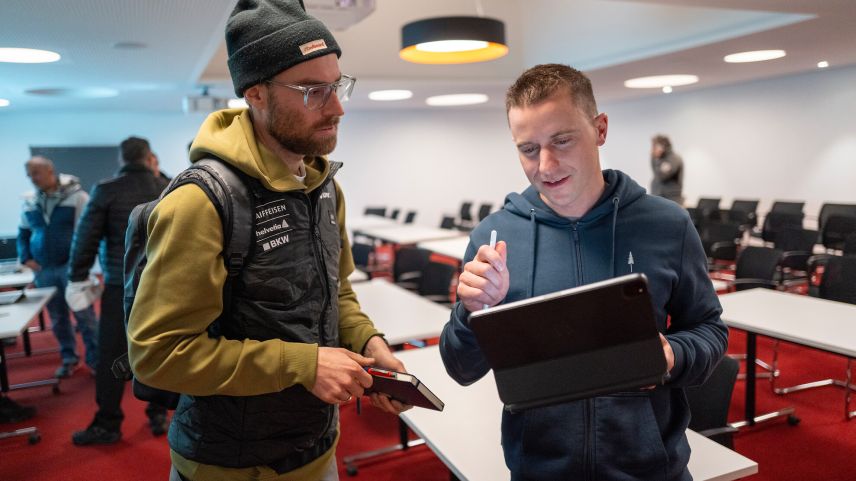Nevin Galmarini im Gespräch mit Nationaltrainer Daniel Weis beim Snowboard-Weltcup in Scuol (Foto: Mayk Wendt).