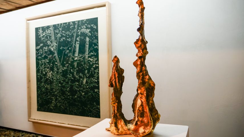 Bild "Sommer II" 2019 von Franz Gertsch und unbetitelte Skulptur von Sara Masüger 2024.
