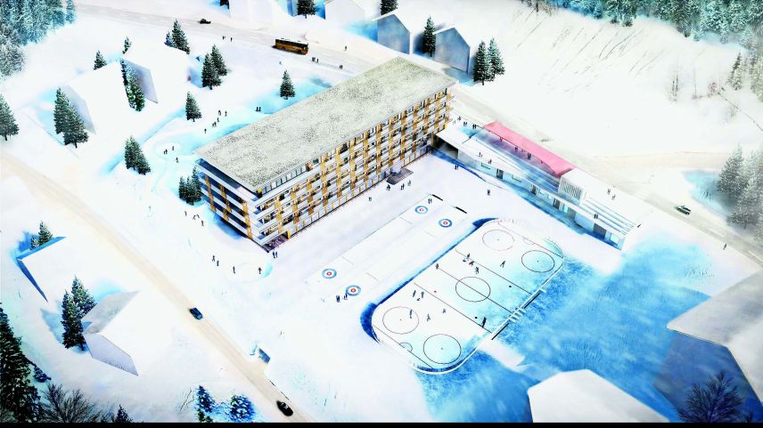 So soll das auf dem Rosegplatz geplante Familienhotel «Flaz» Pontresina mit knapp 200 Betten dereinst aussehen. Visualisierung: z. Vfg