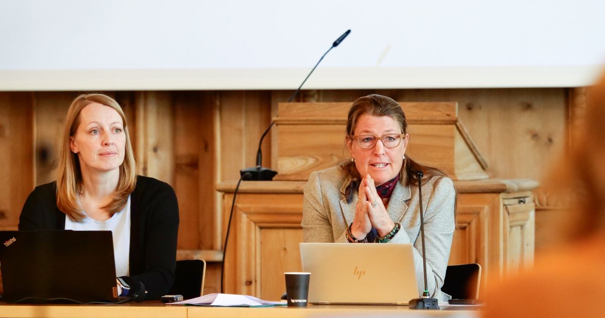 Die Vorsitzende der Präsidentenkonferenz der Region Maloja, Barbara Aeschbacher (rechts). Neben ihr Jenny Kollmar, die Geschäftsleiterin der Region Maloja. Foto: Jon Duschletta