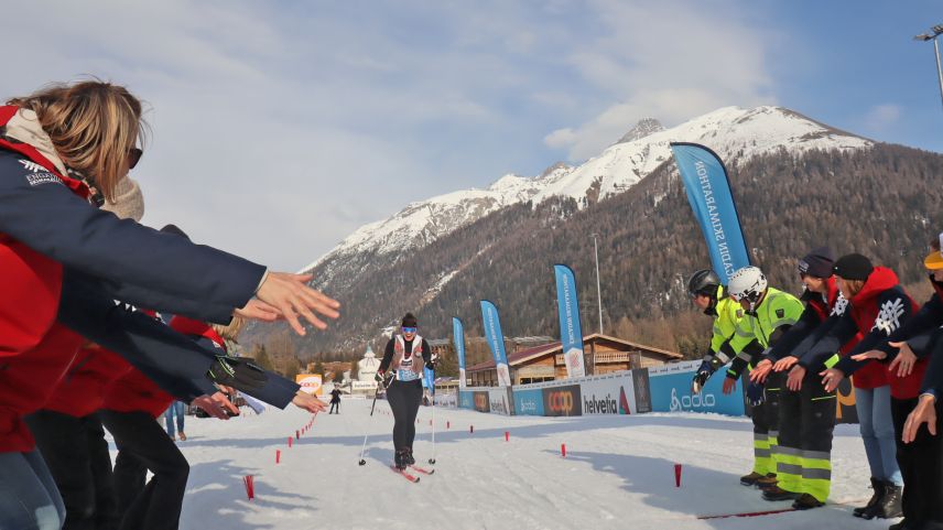 Victoria Vassileva arrivand i’l böt a S-chanf scu ultima curridura dal 55evel Maraton da skis engiadinais cuort zieva las 16.00 in dumengia passeda.