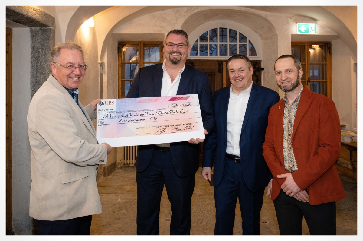 v.l.n.r. Lucian Schucan (Präsident Kulturarchiv), Giovanni Tordi, Franco Borromini (beide UBS St. Moritz), Kurt Gritsch (Leiter Kulturarchiv)