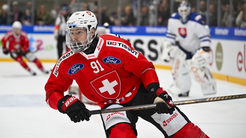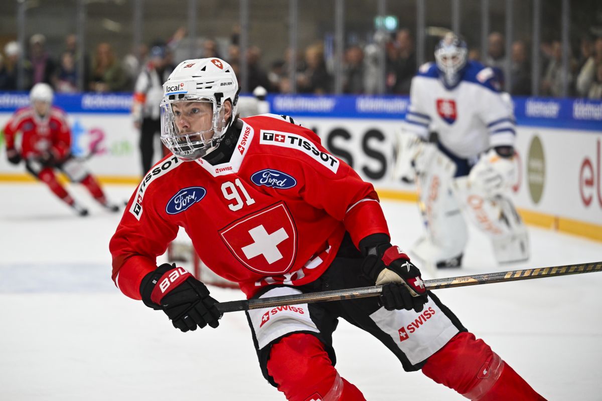 L’Engiadinais Fabian Ritzmann in acziun pella squadra naziunala pro’l gö d’amicizcha cunter la Slovakia (fotografia: Keystone/Gian Ehrenzeller).