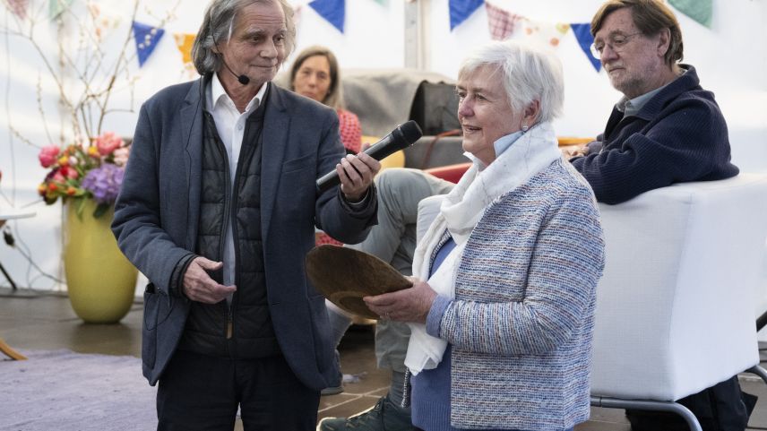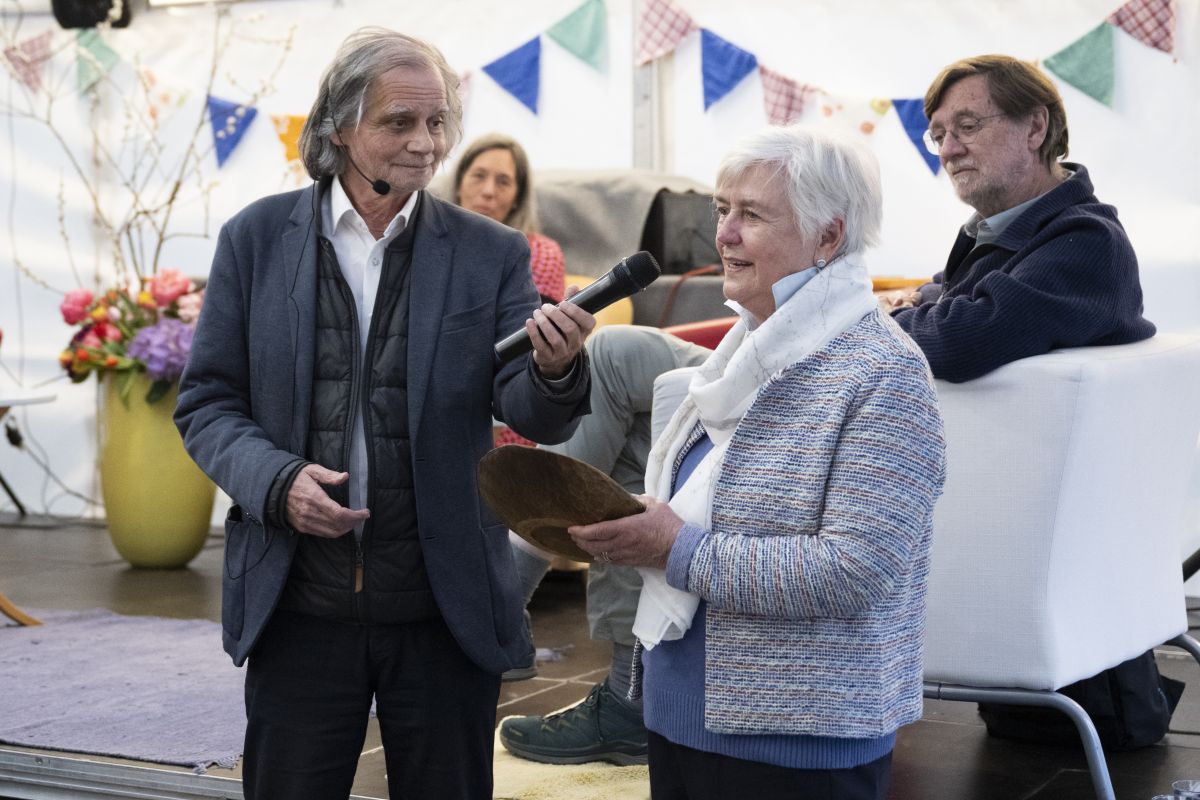 Monika Peter war Schülerin in den Anfangsjahren der Bergschule. Moderator Jakob Fuchs befragt sie zu ihrer Zeit in den 1950er Jahren im Unterengadin. Bild: Mayk Wendt