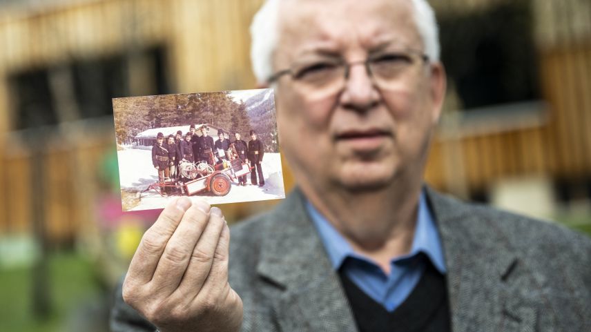 Etienne Aepli war Teil der letzten Schüler-Feuerwehr in Avrona. Er zeigt ein Bild der Feuerwehrgruppe von 1973. Foto: Mayk Wendt