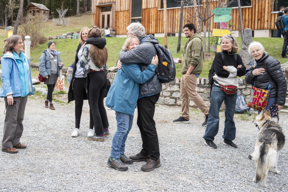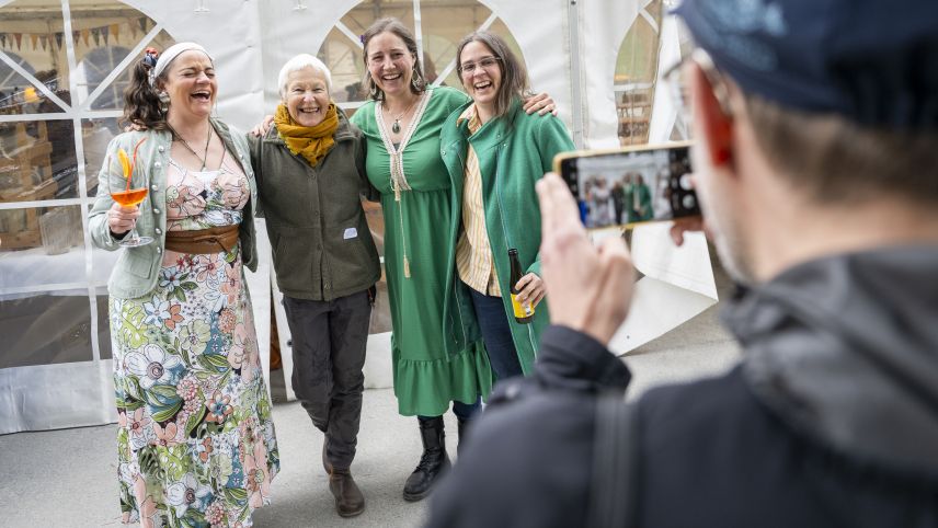 Die ehemalige Mitarbeiterin Vre Bertschinger aus Sent wird mit ehemaligen Schülerinnen fotografiert. Foto: Mayk Wndt