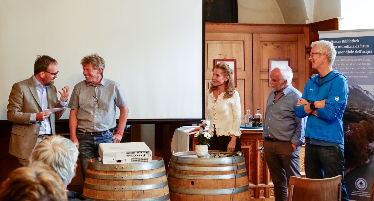 Moderator Christian Gartmann im Gespräch mit dem Glaziologen Martin Lüthi, der Psychotherapeutin Christina Casanova, dem Fotografen Fridolin Walcher und dem Wasserbotschafter Ernst Bromeis (von links). Fotos: Jon Duschletta
