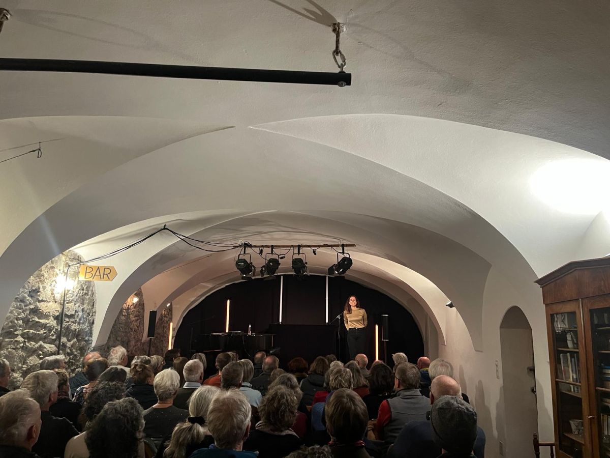 Anna Serarda Campell, la presidenta da la suprastanza, sül palc da La Vouta. Ils vouts caracteristics dal local han dat il nom al lö da cultura a Lavin (fotografia: mad).