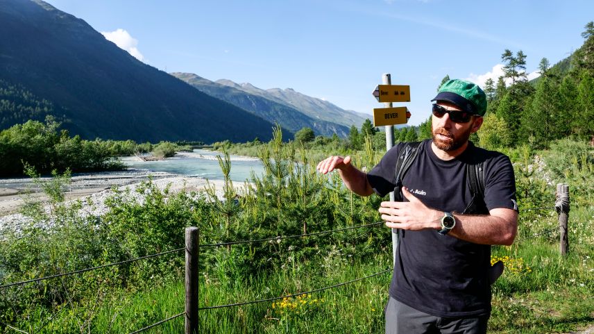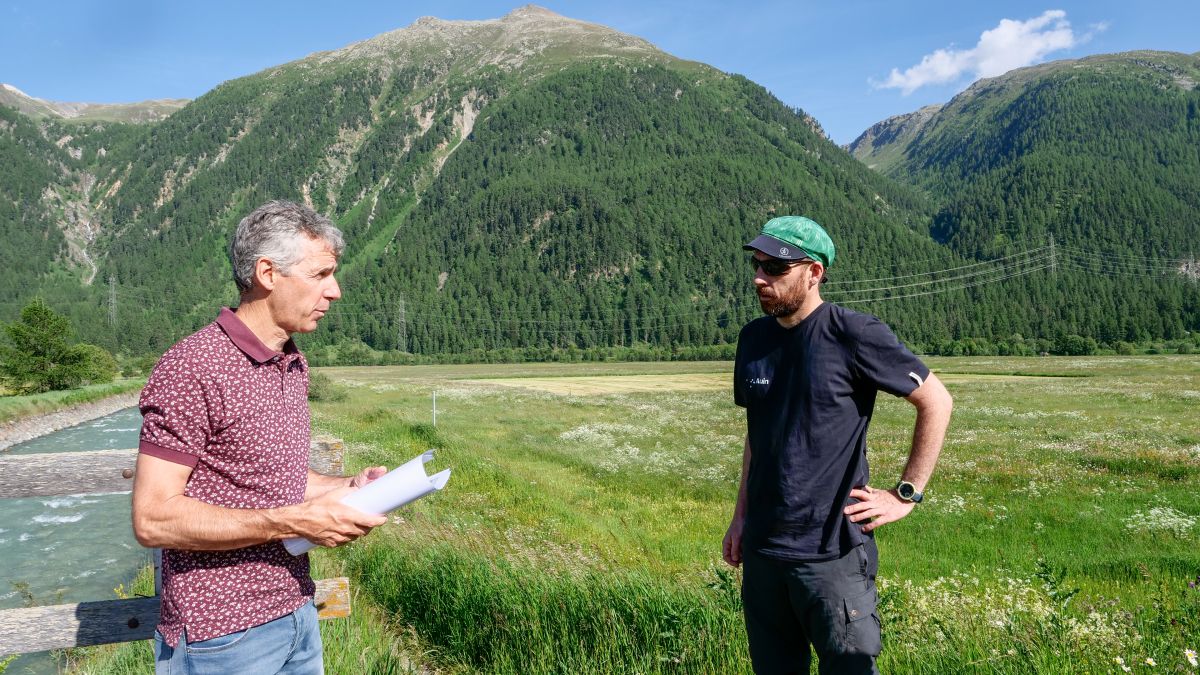 Christian Vögeli an der Aue von nationaler Bedeutung Isla Glischa-Arvins-Seglias im Projektperimeter der Innrevitalisierung "Bever I".