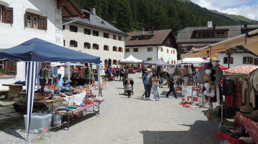 Il marchà artischan immez la fracziun da S-charl – sco adüna in ün ambiaint istoric (fotografia: Benedict Stecher).