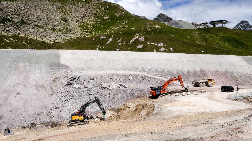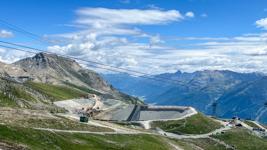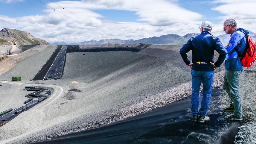 Adrian Jordan (links) mit einem Teilnehmer der Baustellenführung auf dem Damm des neuen Lej Nair Pitschen auf Corviglia. Am 13. August wird der Speichersee vom dafür zuständigen Bundesamt für Energie abgenommen und kann danach befüllt werden.