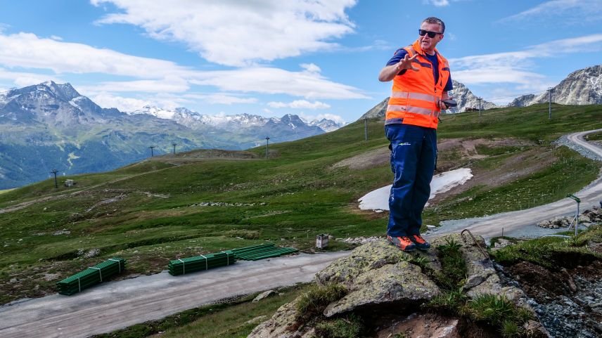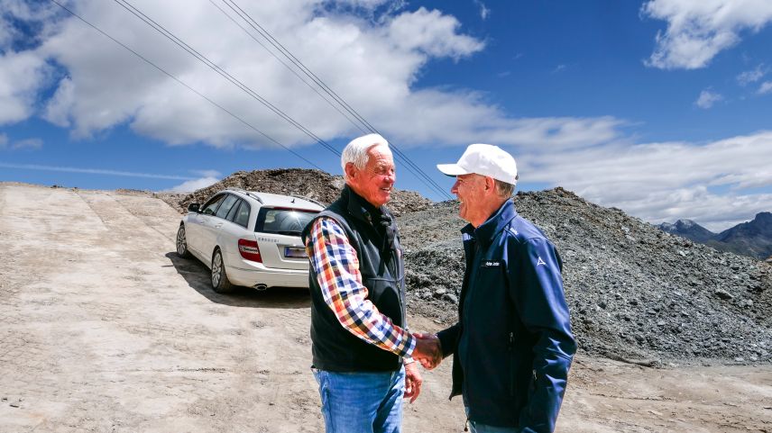 Baumeister und Vegetationsziegel-Spezialist Hauser Bacher (links) im Gespräch mit Adrian Jordan von der Engadin St. Moritz Mountains AG.