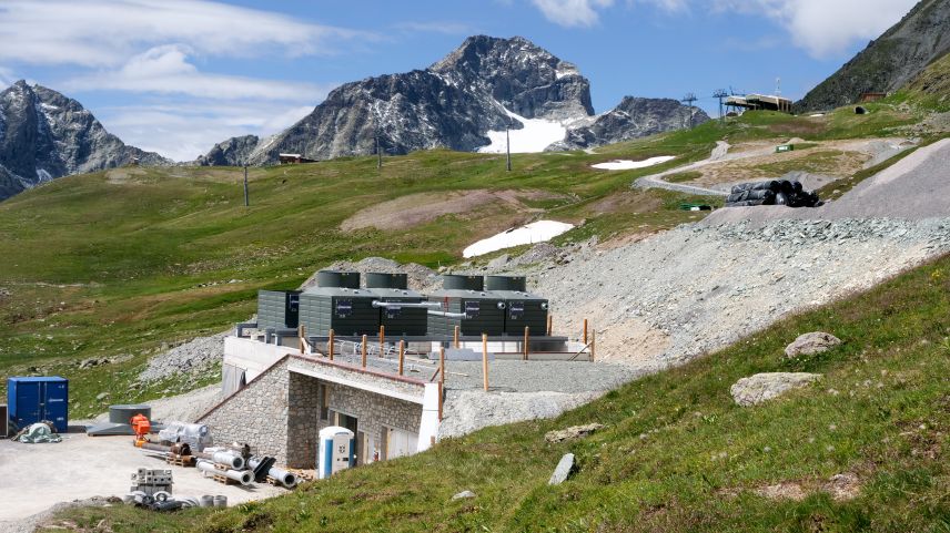 Unterhalb des Lej Nair Pitschen liegt die Verteilstation. Von hier aus werden die Beschneiungssysteme mit Schmelzwasser gespeist. Auf dem Dach die luftbasierte Wasserkühlung.