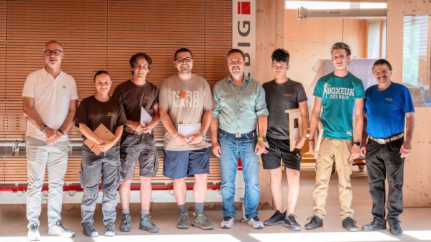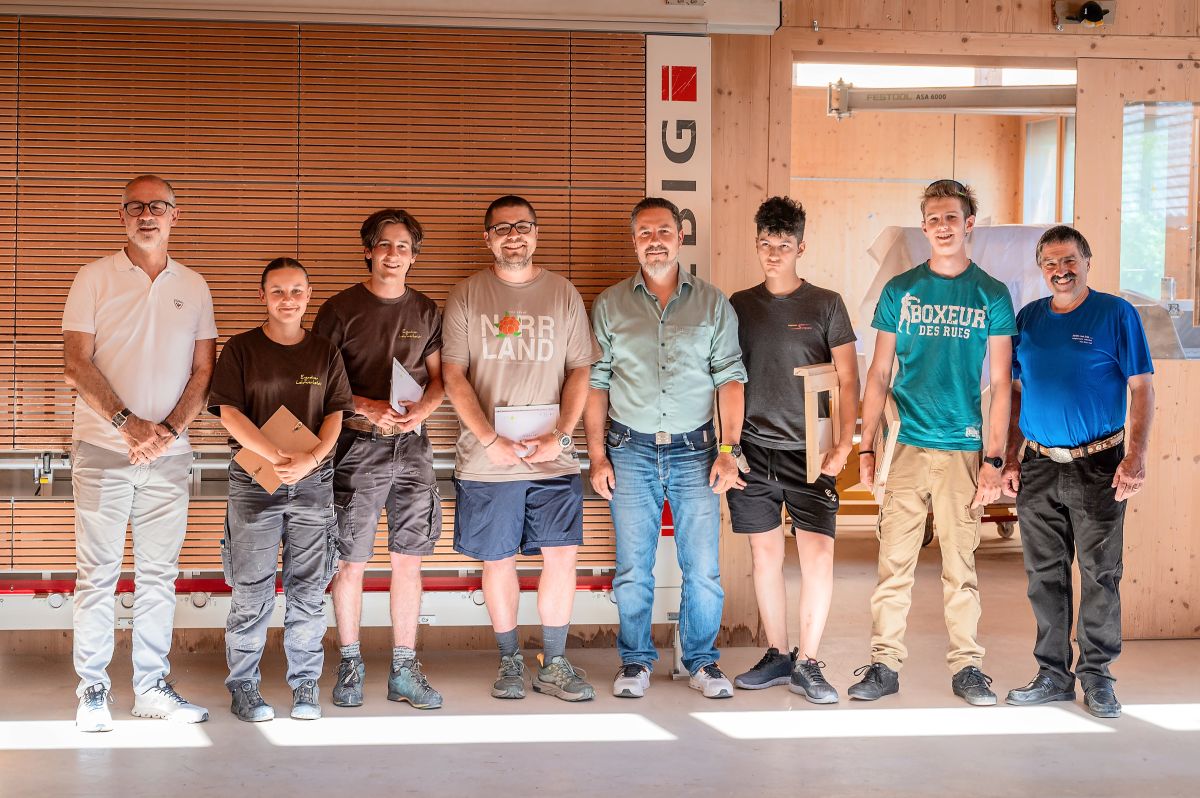 Auf dem Foto sind die Prämierten der verschiedenen Wettbewerbe wie auch Vertreter der BDN Engiadina Stiftung versammelt. Namentlich sind das, von links: Alessandro Forcello, Präsident BDN Engiadina Stiftung, Mia Sonder, Engadiner Lehrwerkstatt Samedan (LWS), Gewinnerin des Wettbewerbs «Holz in Form», Loreno Baracchi, LWS, Gewinner Wettbewerb «Holz Kreativ», Yanik Debrunner, LWS, Gewinner Wettbewerb «Unternehmens-Modell», Marcus Albrecht, Geschäftsführer LWS, Manuel Mayer, Falegnamaria Salzgeber SA, La Punt, Dritter beim Wettbewerb «Engadiner Reisskönig», Filippo Castelanelli, Rezzoli GmbH, Brusio, Gewinner «Engadiner Reisskönig» und Gian Marco Naef, VSSM Quattervals. Nicht auf dem Bild ist Alessio Illarietti, Rezzoli GmbH, Brusio, als Zweiter des Reisskönig-Wettbewerbs. (Einges.)