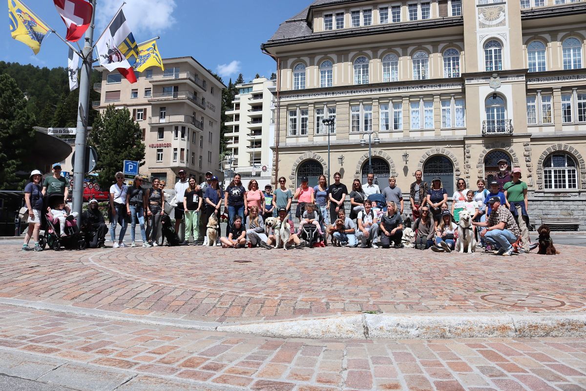 Gruppenbild nach einem Training zum Thema Verhaltensbeobachtung in St. Moritz. 30 Erwachsene, 20 Kinder und 15 Hunde trafen sich für einen Erfahrungsaustausch über ihre Epilepsiewarnhunde