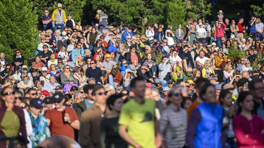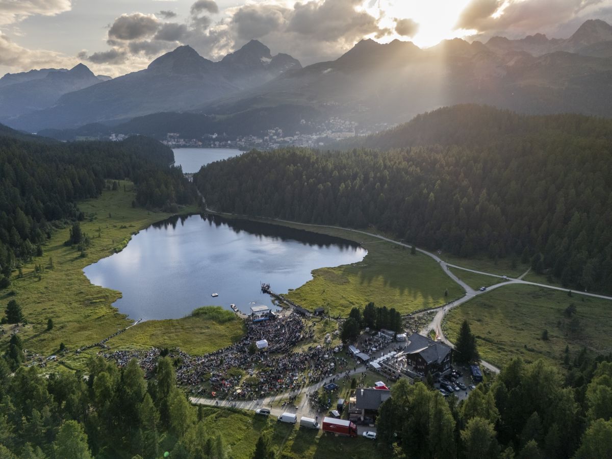 Sonntagabend, kurz vor 19 Uhr am Lej da Staz. Die Abendsonne taucht die Moorlandschaft in ein goldenes Licht. Von überall her strömen die Menschen zum Konzertareal, auf Velos, mit Kindern oder Hunden. Sie suchen sich ein Plätzchen zwischen dem Gebüsch, am Hang oder direkt vor der Bühne. Sie breiten auf Picknickdecken Essen und Getränke aus, schwatzen und lachen. Alte Bekannte begrüssen sich freudig, immer wieder winkt jemand jemandem aus der Ferne. Am Steg beim See geniessen einige die letzten Sonnenstrahlen, während andere schwimmen. Es riecht nach Pommes Frittes und Bratwurst, irgendwo lässt jemand den Korken einer Prosecco-Flasche knallen. Open-Air-Atmosphäre.