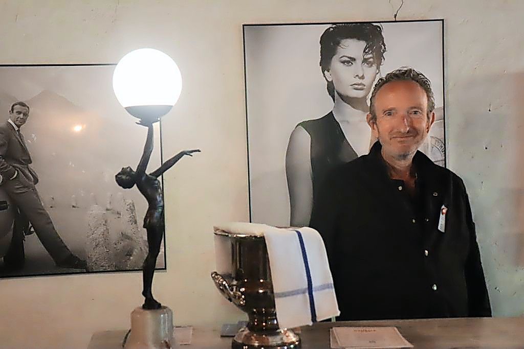 Ramun Schweizer, il possessur ed hotelier da la Chasa de Capol a Sta. Maria davant la bar da kino (fotografia: Martin Camichel).