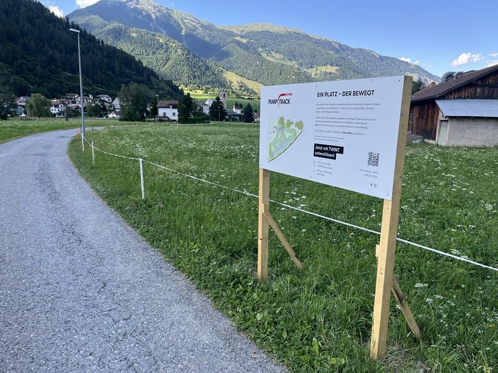 La tabla a Müstair chi renda attent al crowdfunding pel proget dal pumptrack (fotografia: David Truttmann).