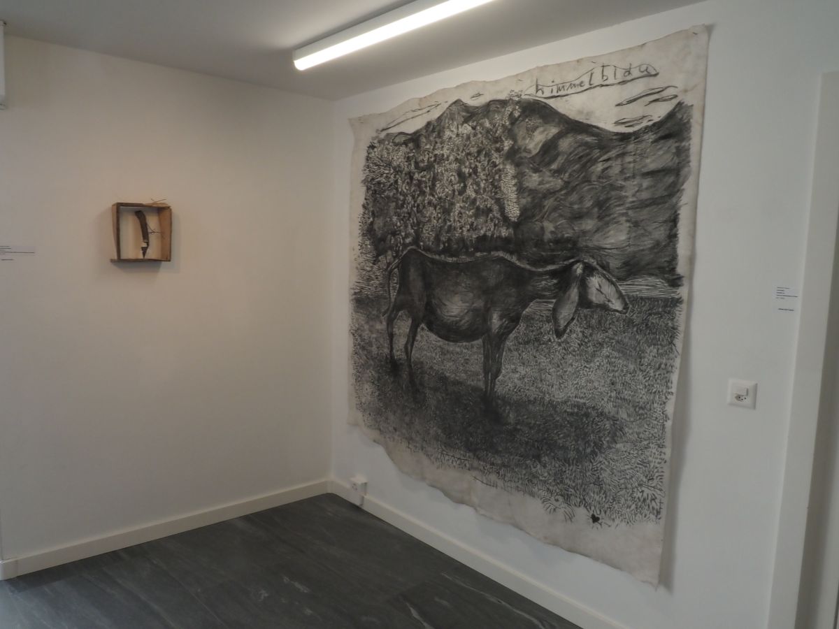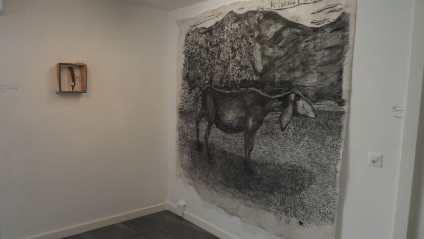 Ein übergrosses Schaf als Zeichnung an der Wand, rechts davon die Espressomaschine und dahinter das Rahmengeschäft. Die Galerie Bolt & Bolt hat seit Dezember 2024 in Celerina geöffnet und stellt Werke von regionalen und überregionalen Künstlern aus.