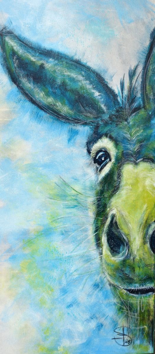 Es ist nicht «nur» Blumenschmuck, der die Gäste empfängt. Es ist mit künstlerischer Hand inszenierte Gemütlichkeit, die neugierig macht auf den oder die Menschen, die dies gestaltet haben. Bei der Rezeption wird man von einem Esel empfangen, einem halben Esel eigentlich, in Blautönen auf die Leinwand gezaubert. Die Künstlerin dieses Werkes ist Coni Schuster, Hotelière und Gastgeberin des Hotels Villa Stelvio in Sta. Maria. Gemeinsam mit ihrem Ehemann Stefan ist sie seit 2017 Eigentümerin dieses alten, ehrwürdigen Hauses, das die beiden mit viel Liebe und Geschmack zu einem wahren Kleinod umgestaltet und restauriert haben.
