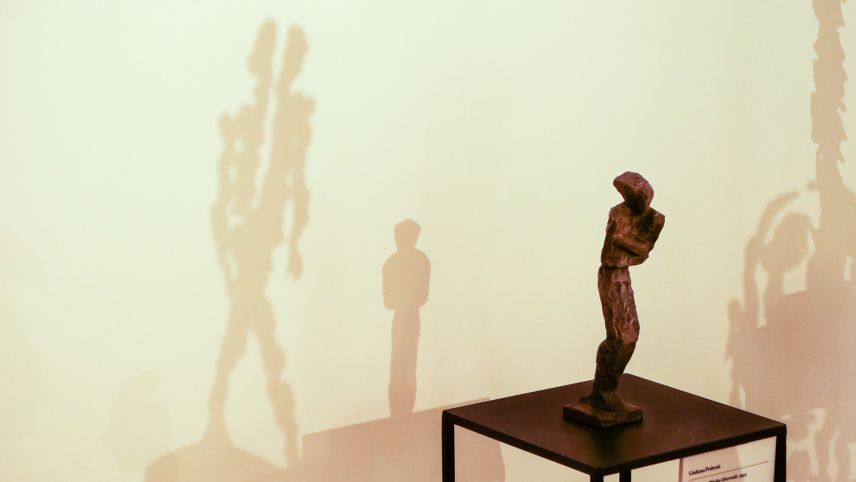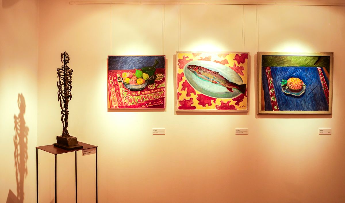 Von links: Bronzeskulptur «Halb Schatten, halb aufgelöst im Licht – Mann am Strand» von Giuliano Pedretti 2011 und drei Ölgemälde «Die grüne Birne» 1952, «Grosse Forelle auf Teller» 1953 und «Ananas» 1952 von Turo Pedretti. Fotos: Jon Duschletta