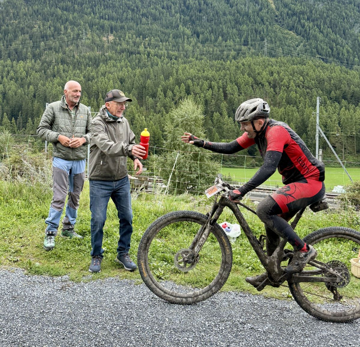 Der Regen hat aufgehört. Die Stimmung ist gut am Streckenrand bei Lavin. Es wird geplaudert, gelacht, Hopphopp und Heja gerufen. Erinnerungen an Ereignisse der Vorjahre werden ausgetauscht. Immer mehr Helfer und andere Familien treffen ein, um ihre Athletinnen und Athleten zu unterstützen. Der Erste, der vom offiziellen Nationalpark Bike-Marathon Team zu sehen ist, ist Michael Müller. Er rennt neben seinem Bike her. «Die Batterie ist leer», ruft er auf die Frage, ob er Hilfe benötige. Dann schwingt er sich wieder in den Sattel und fährt weiter. Ins Ziel wird er wenig später als 19. in der Königsdisziplin einfahren. Nach genau fünf Stunden und 110 Kilometern.
