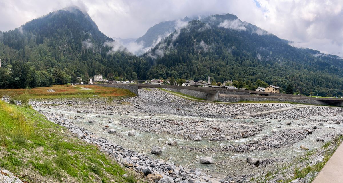 Promontogno und Bondo (rechts) von Sottoponte aus gesehen mit den drei neuen Brücken und dem Auffangbecken am Zusammenfluss von Bondasca und Maira.