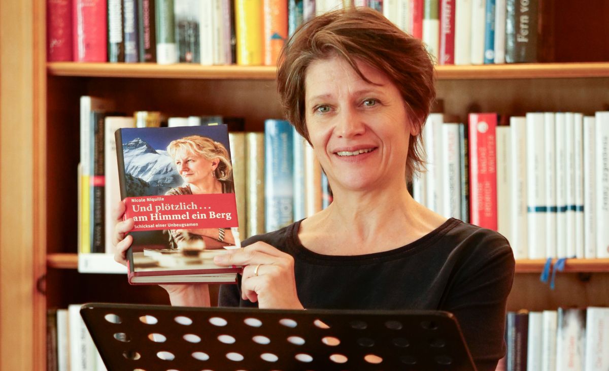 Franziska von Fischer mit dem Buch "Und plötzlich... am Himmel ein Berg" von Nicole Niquille, der ersten diplomierten Bergführerin der Schweiz.
