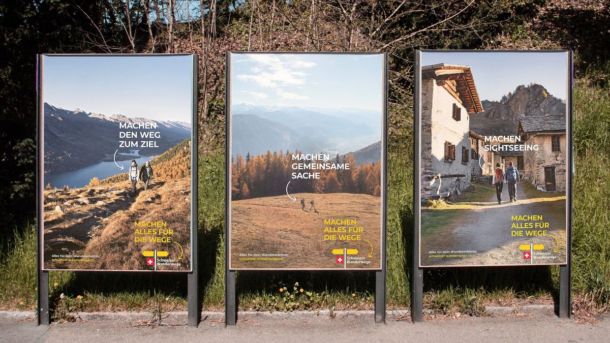 Werden unter anderem an Bahnhöfen zu finden sein: Plakate der Kampagne "Alles für die Wege" des Verbands Schweizer Wanderwege. Foto: Verband Schweizer Wanderwege.