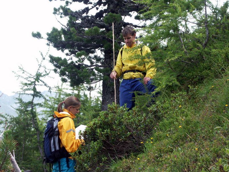 SLF-Forscher Peter Bebi (rechts) vermisst im Jahr 2005 die Bäume auf der Aufforstungsfläche gemeinsam mit der Masterstudentin Martina Forster.