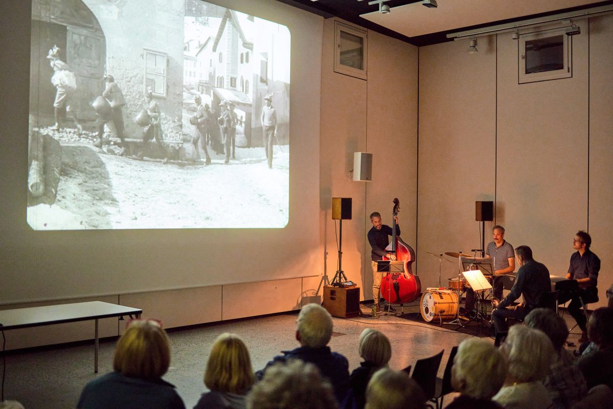 Il musicist Simon Quinn (cul gïun) e sia band «Sprachlos» han sonorisà live il film istoric dal Parc Naziunal Svizzer (fotografia: Michael Steiner).