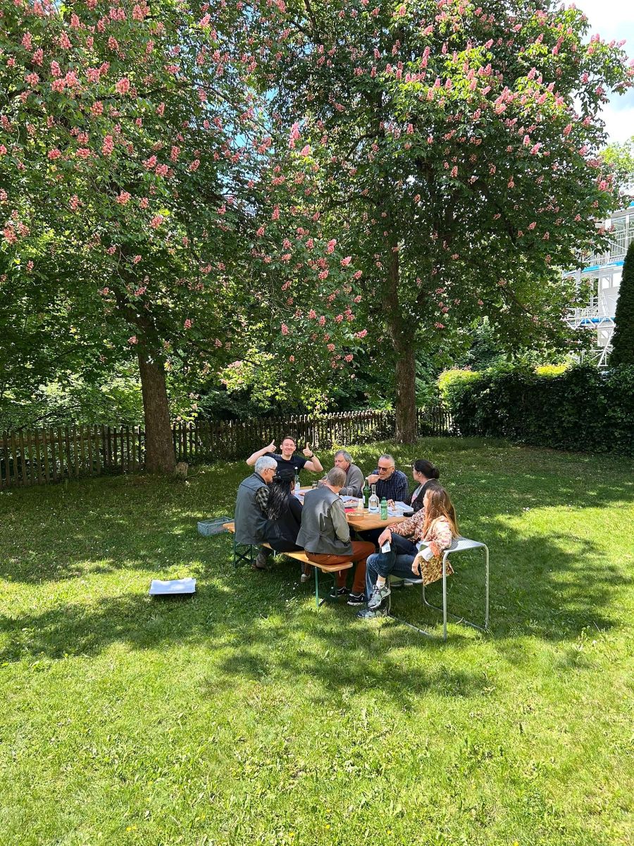 Las partecipantas ed ils partecipants dal cuors da scirver litterar dürant la posa da mezdi i'l üert da la Lia Rumantscha (fotografia: Gianna Olinda Cadonau)