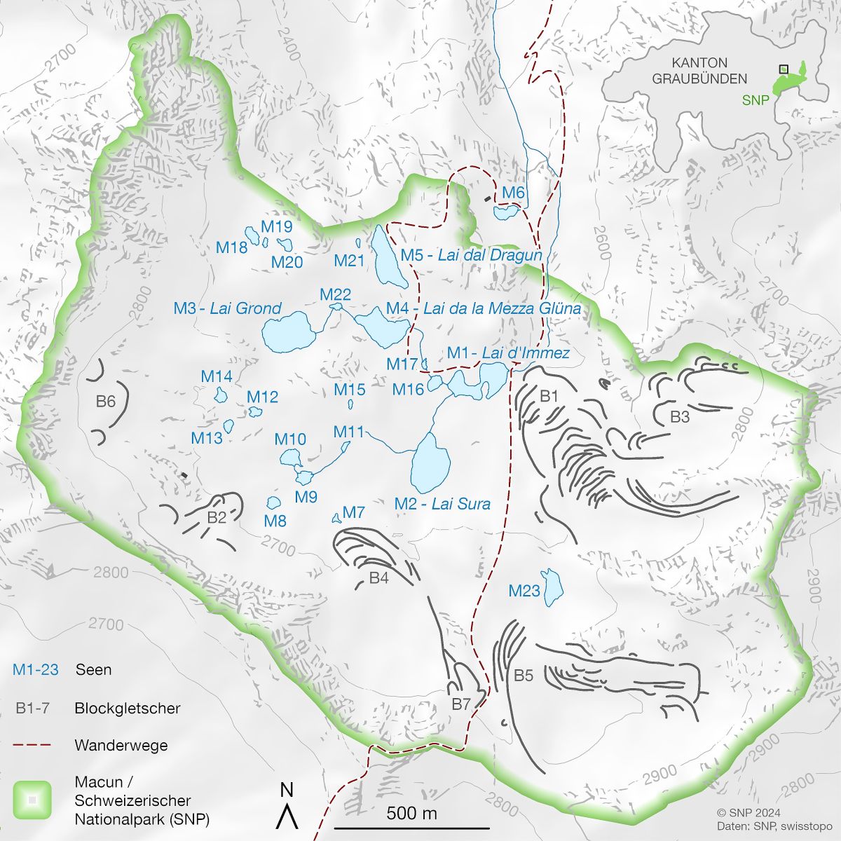 Die Karte zeigt die Vielfalt der Seen und Weiher von Macun. Foto: GIS SNP