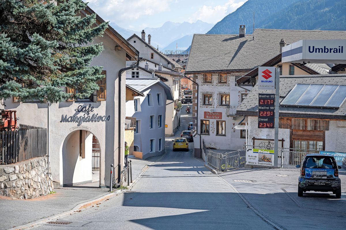 La via stretta da Sta. Maria, ingio cha tuot il trafic sto passar tras. Impustüt dürant ils dis cun grond travasch procura quist traget per colonnas e