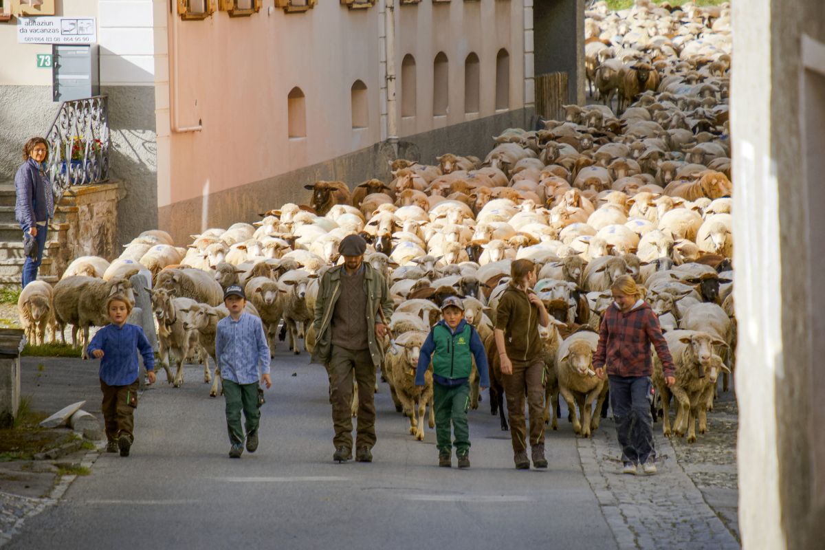 Am frühen Morgen lag noch Nebel über dem Dorf. Auf den Weiden grasten die Schafe, welche mit ihren Lämmern schon heimgeholt worden waren. Gegen halb elf war es so weit. «Sie kommen», wurde von Mund zu Mund dorfaufwärts weitergereicht. Dann waren sie da: 770 Schafe und eine Ziege drängten sich durch die Ftaner Gassen, angeführt von Hirte Damian Bänziger und einigen Kindern. Trotz Frühstück auf den Wiesen vor dem Dorf büxten beim Anstieg nach Ftan Pitschen einige Schafe aus, um noch einmal in ein paar saftige Gräser zu beissen.