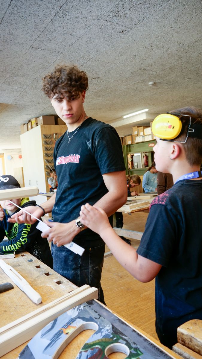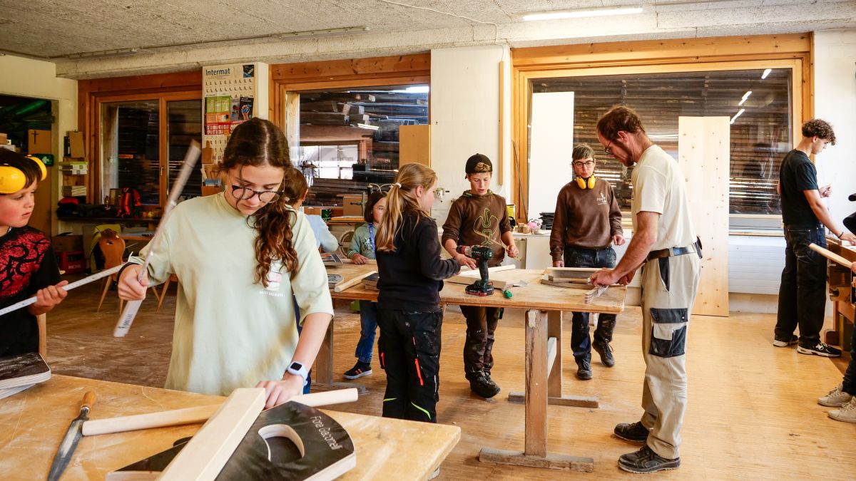 Blick in die Werkstatt der Schreinerei Pichalain in Fuldera, wo am Donnerstagnachmittag Schülerinnen und Schüler unter fachlicher Anleitung die Arbeit an ihrem Skibob weiterführten.