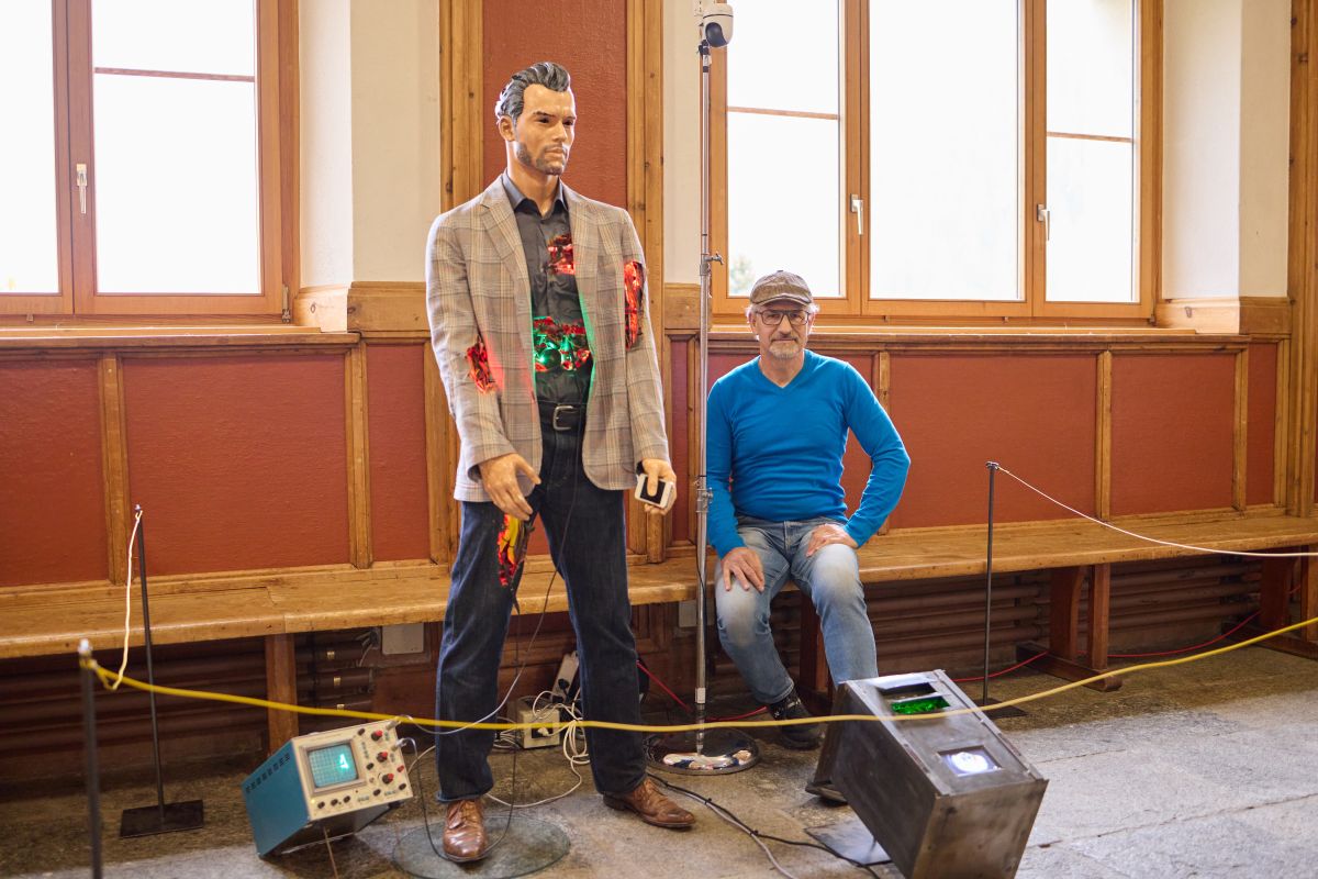 Il Analog-Digital-Disorder-Man in chasa da scoula a Scuol, scurzni ADD-Man. Sper el es seis creader, l’artist René Fritschi (fotografia: Michael Steiner).