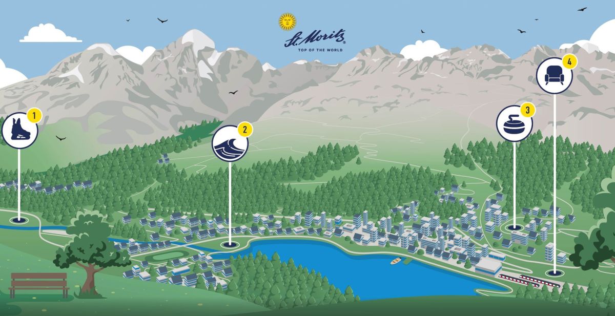 Eis- und Wertstoffhalle sollen nach Islas kommen (1), am See entstehen Freiflächen (2), Curling wäre beim Hotel Kulm geplant (3) und am Bahnhof könnten Wohnungen entstehen (4). Visualisierung: Gemeinde St. Moritz