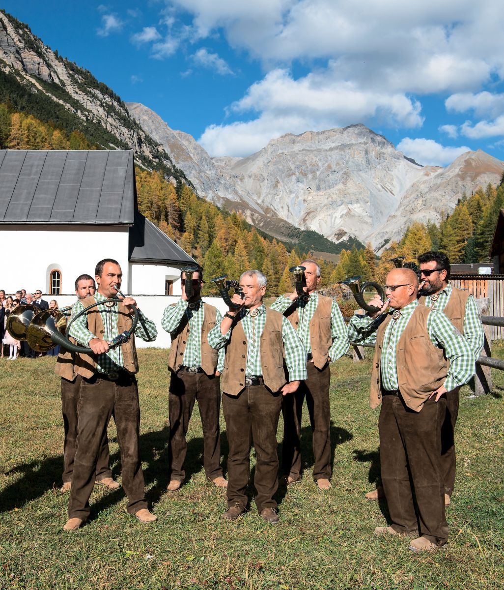 Matthias Merz da Scuol es president dal Coro viril Engiadina Bassa e vicedirigent da la Gruppa da corns da chatscha da Scuol (ourasom a dretta cul corn da chatscha) (fotografia: mad)