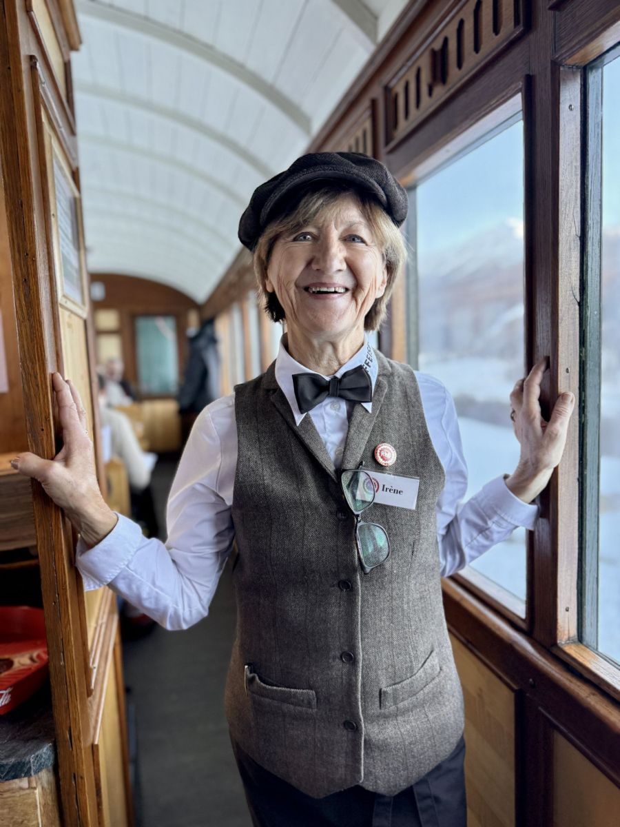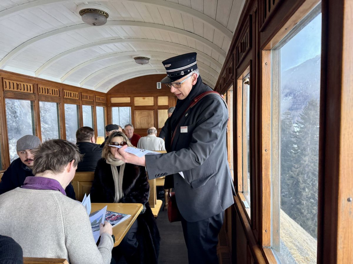 Um Punkt 10.02 Uhr pfeift die «Engiadina» und verkündet damit die Abfahrt. Schon setzt sich der Zug in Bewegung. Während die Fahrgäste sich auf den Holzbänken der 2. Klasse oder in den Polstern der vier Abteile des 1. Klasse-Wagens von 1903 ausbreiten und die vorbeiziehende Winterlandschaft geniessen, beginnen die freiwilligen Helfenden des Historic RhB Gastro-Teams des «Samadner Club 1889» und des Vereins Dampffreunde RhB mit der Arbeit. Davide Rüetschi verkauft im «Barwagen F4» kalte Getränke und Snacks, Irène Plüss bedient die Gäste der ersten Klasse mit Prosecco und Brötchen, während zwei weitere Kollegen Kaffee, Gipfeli und kalte Engadiner Spezialitäten im Speisewagen servieren.