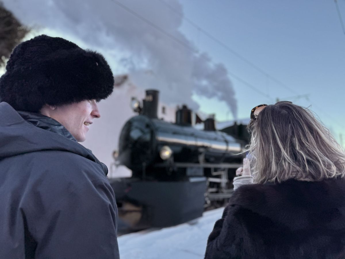 In einem Belle-Epoque-Coupé sitzt beispielsweise Hans-Georg Class mit Sohn Johannes. Sie sind eigens aus Stuttgart angereist und die Dampffahrt durchs Engadin zu erleben. Es ist ein Weihnachtsgeschenk für den bahnbegeisterten Sohn. «Bei uns fährt die komplette Rhätische Bahn im Garten» erzählt der Vater schmunzelnd. Johannes kann den Mitreisenden sogar Details der «Engiadina» liefern. «Baureihe G4/5. Das bedeutet fünf Achsen, vier davon angetrieben».