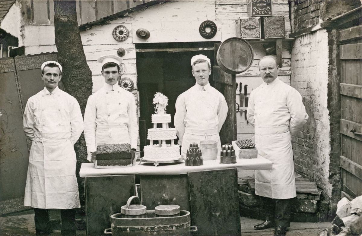 Bündner Zuckerbäcker in der Konditorei und Restaurant Lardi in Southampton, England, 1910. Foto: Associazione iSTORIA/Archivi fotografici Valposchiavo