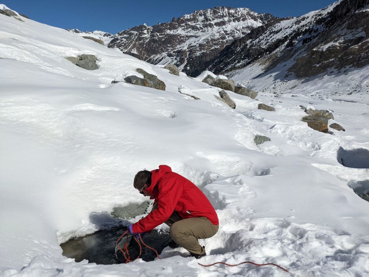 Die Forschenden nehmen Wasserproben vom Morteratschgletscher bis zum Inn in Martina. Foto: Timo Rhyner