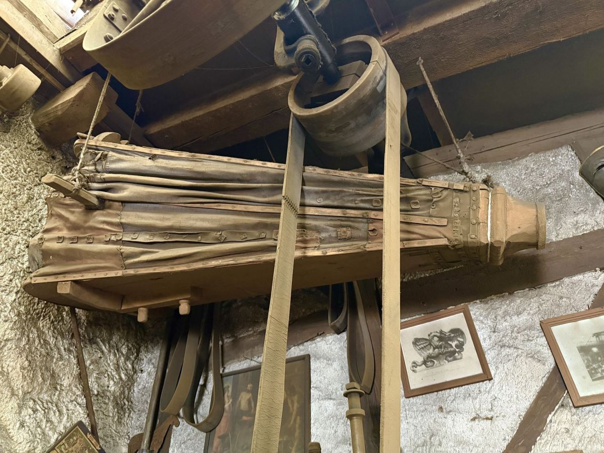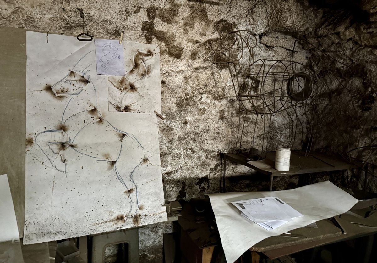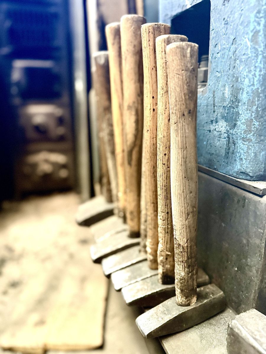 Die Schmiede von Curdin Niggli ist ein Ort, an dem die Zeit stillgestanden zu sein scheint. Das Herzstück des Raums bildet die Esse mit dem Rauchabzug, vor dem ein massiver Amboss steht. Hammer in verschiedenen Grössen hängen an mehreren Stellen, Skizzen liegen auf einem Holztisch, zwei riesige Blasebälge sind an der Decke befestigt, überall ist Metall in unterschiedlichen Formen und Grössen zu sehen, ein Sammelsurium an fertiggestellten und noch nicht angefangenen Werken.